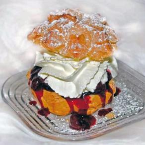 Eis, frische Früchte, frische Sahne, Eierlikör, Fruchtsoße |
